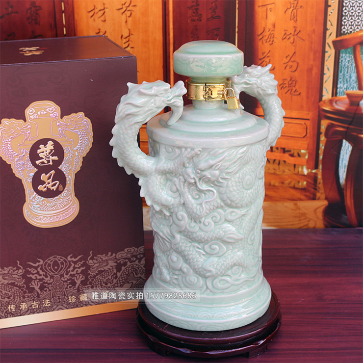 【品名】:1斤10斤装青釉雕刻双龙酒坛礼盒【价格】:1斤4瓶礼盒装110元/套(物流4套1箱),10斤装130元/套(物流4套1箱)【产地】:景德镇【工艺】:青釉雕刻【容量】:1斤、10斤【包装】:礼盒包装