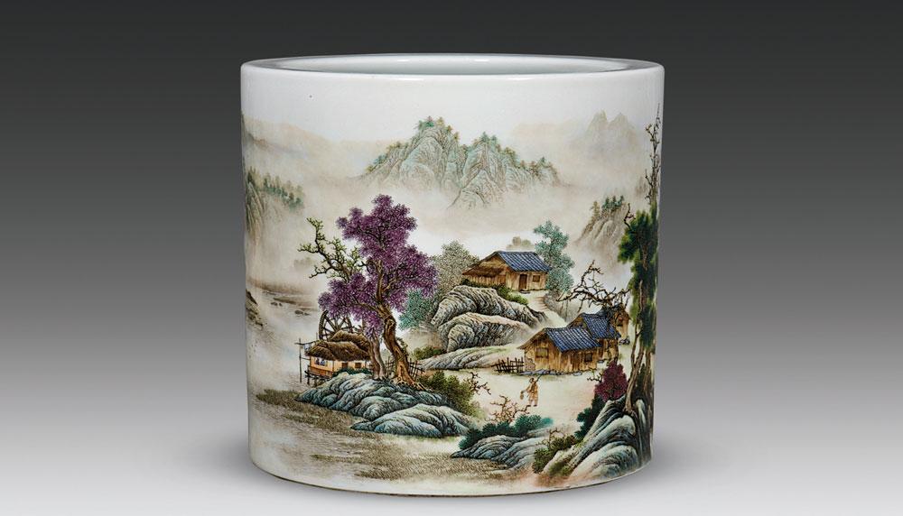 大小堆积,长短簇拥,其形好似香蕉,其势犹如涌涛,颇具质感和动感。为令人叹服的是,通幅画作虽多用醇清翠亮而不透明的青绿设色,但却能在敷色时既不掩盖原来的勾擦皴色,又能使瓷画中的山石树木结构清晰,分出阴阳,艳而不俗,故显得既明丽、沉着,又活泼、生动、细腻,显现出笔法讲究、造型精美、用色得当、意境幽秀的审美特征。