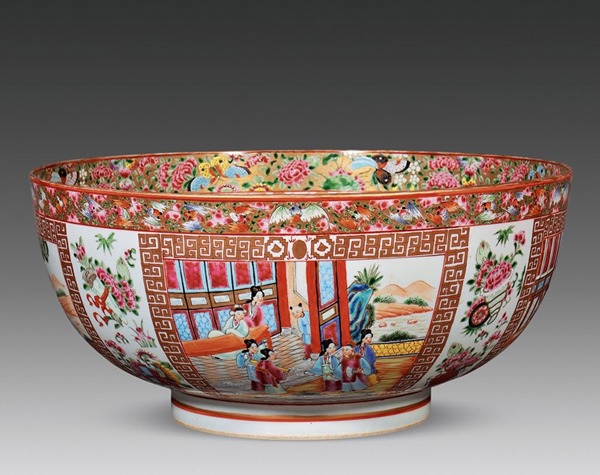 广彩的装饰风格是构图丰满,密难行针,紧而不乱,犹如万缕金丝织于白玉之上。它的另一个重要的装饰特点是满地加彩,不漏白胎。
